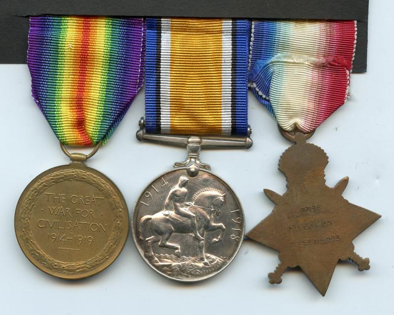 1914 Mons Star with Clasp 5th Aug-22nd Nov 1914 (10185 Pte G Clark, 2/ Sea Highrs ); British War & Victory Medals 1914-1919 ( 10185 Pte G Clark, Sea Highrs)