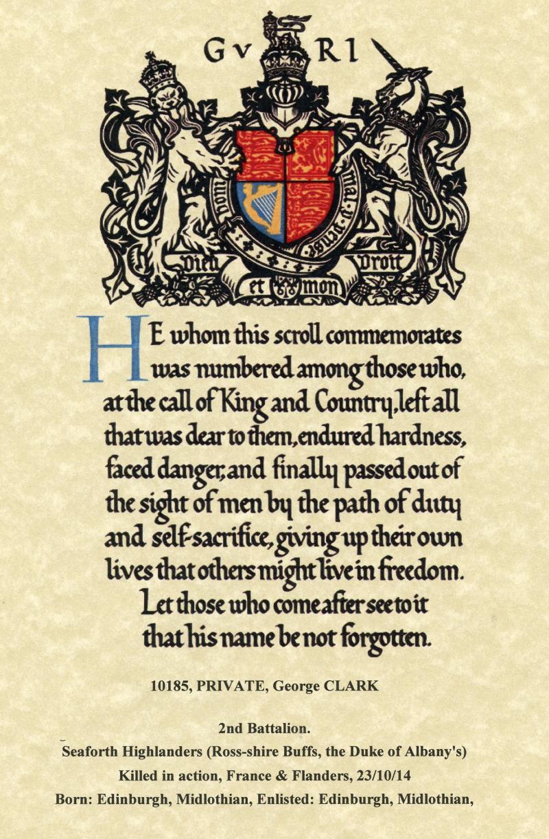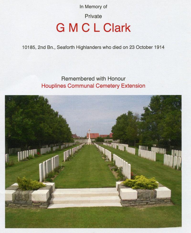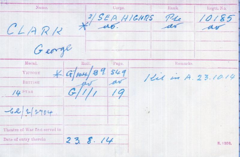 Pte George Clarke, 2nd Bn., Seaforth Highlanders was Killed in Action on 23 October 1914