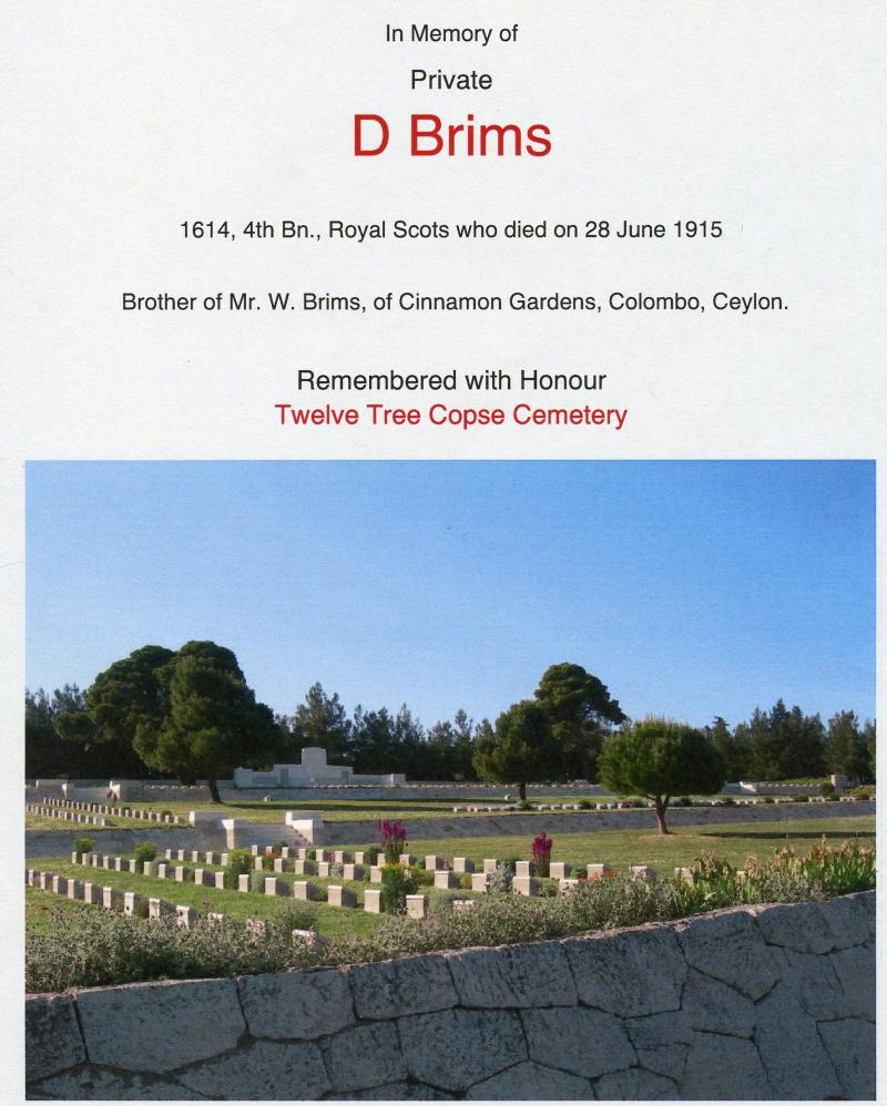 Brother of Mr. W. Brims, of Cinnamon Gardens, Colombo, Ceylon.