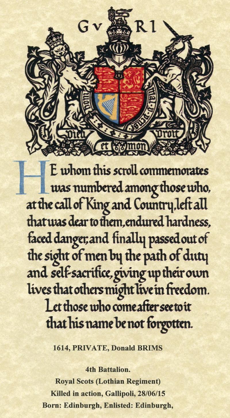 4th Bn., Royal Scots was Killed in action in Gallipoli at Achi Baba on 28 June 1915