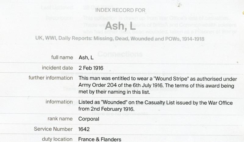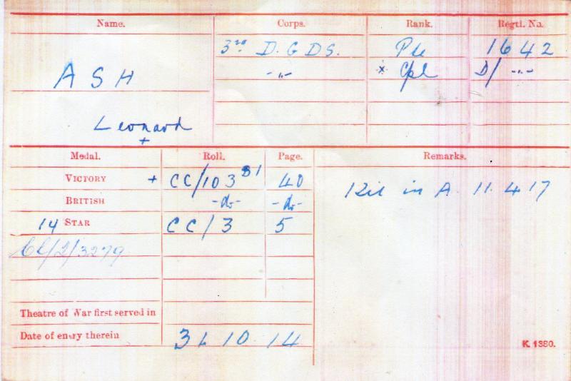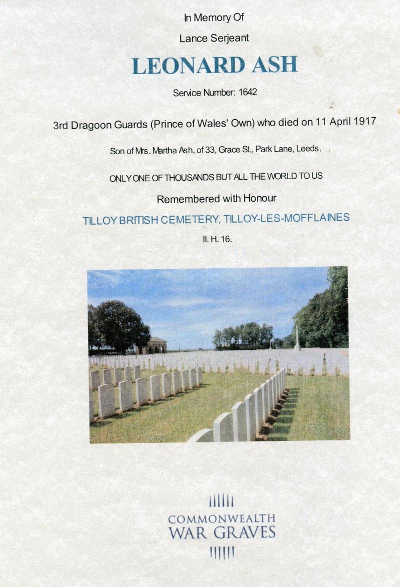 Lance Sergeant Leonard Ash, 3rd Dragoon Guards (Prince of Wales' Own) was wounded Feb 1916 and later was Killed in Action on 11 April 1917