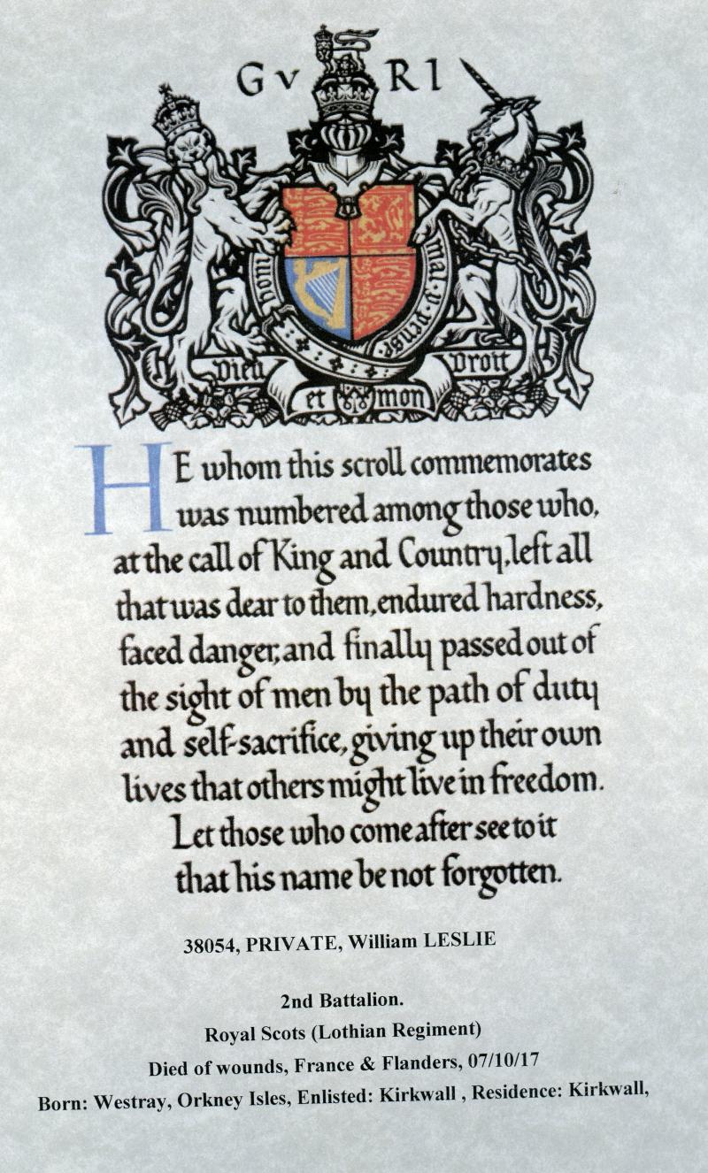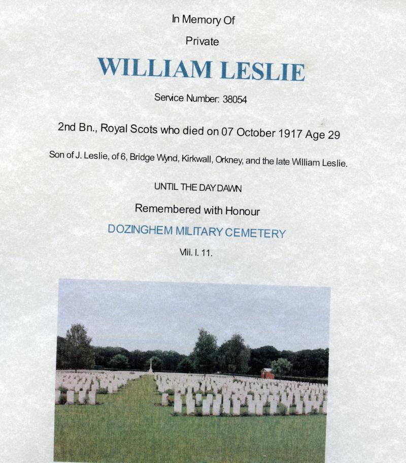 Son of J. Leslie, of 6, Bridge Wynd, Kirkwall, Orkney, and the late William Leslie.