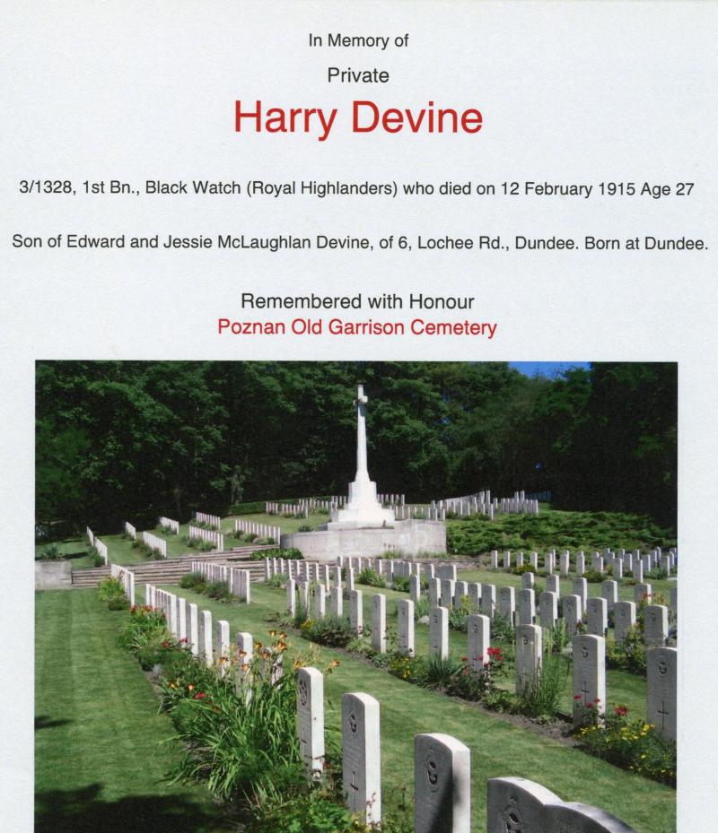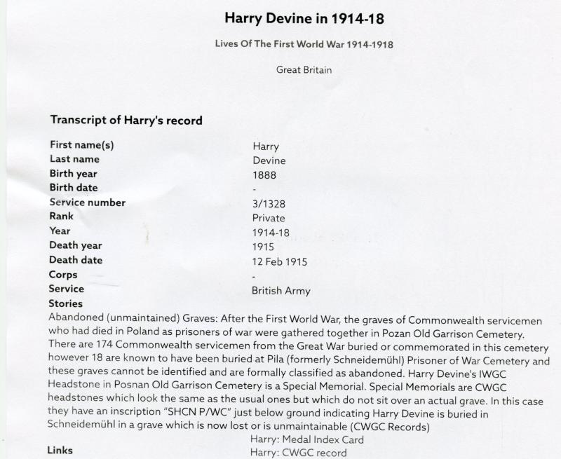1st Bn., Black Watch (Royal Highlanders) Died whilst a prisoner of War 12 February 1915 Age 27 buried in Pila formerly Schneidemuhl Prisoner of War Cemetery Poland