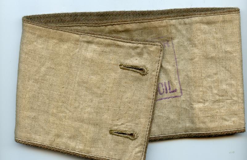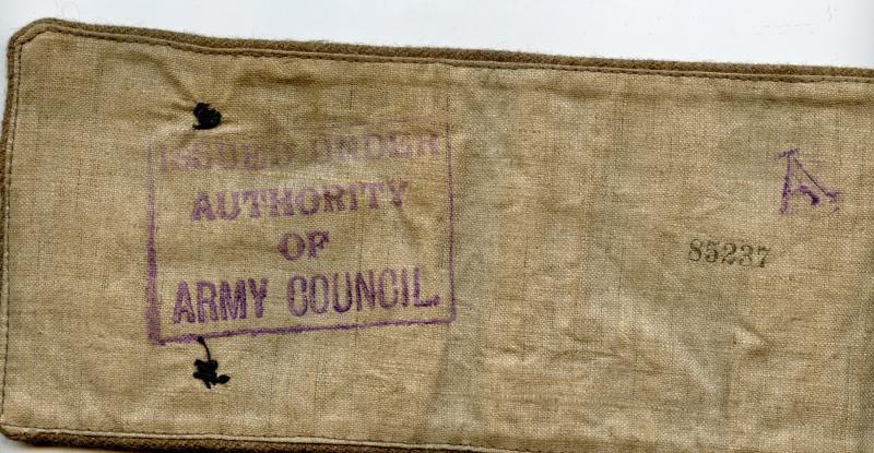 armband secured at the rear by 2 buttons . The front of the armband with red felt Kings crown . Backing with makers details and Army Authority details