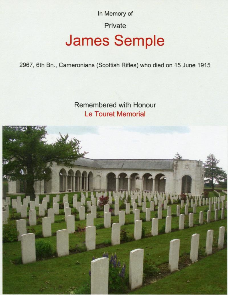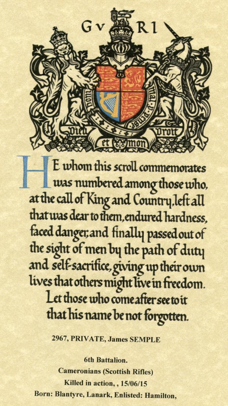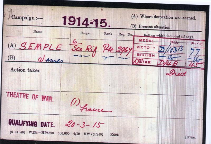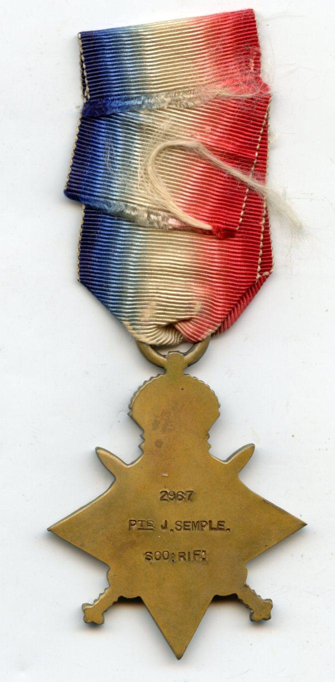 WW1 1914 -15 Star Medal To Pte James Semple 6th Bn., Cameronians (Scottish Rifles)