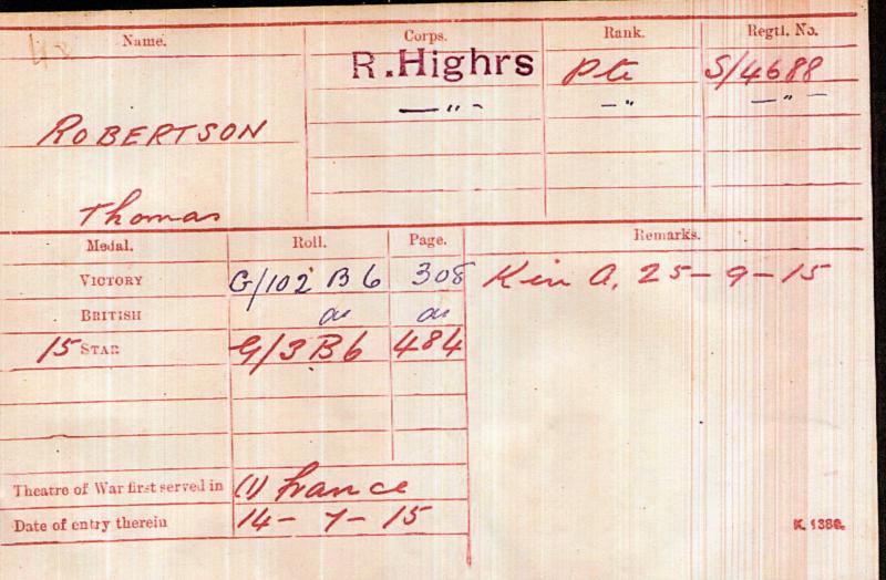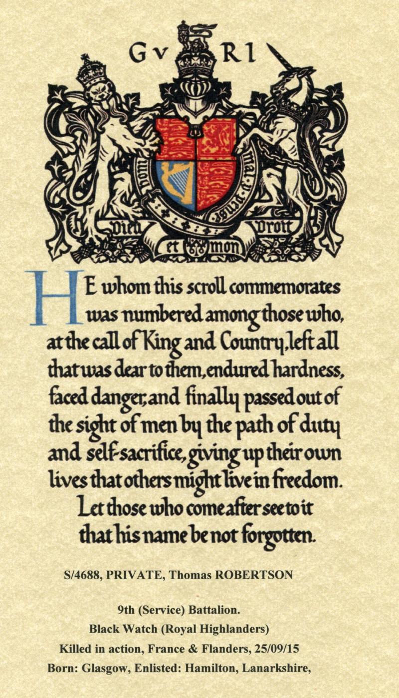 WW1 1914-15 Star & Victory Medal To Pte Thomas Robertson, 9th Bn., Black Watch (Royal Highlanders)