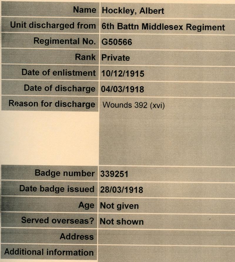 Pte Albert J Hockley, 6th Battalion Middlesex Regiment