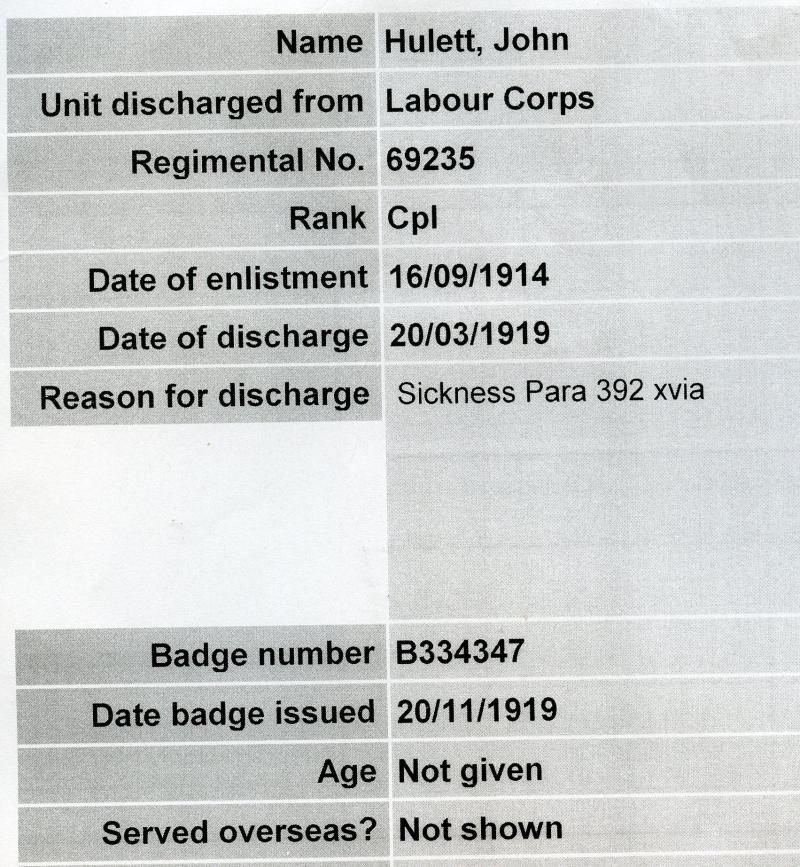 Silver War Badge Awarded to 69235 Pte John Hulett, Royal Fusiliers & Labour Corps
