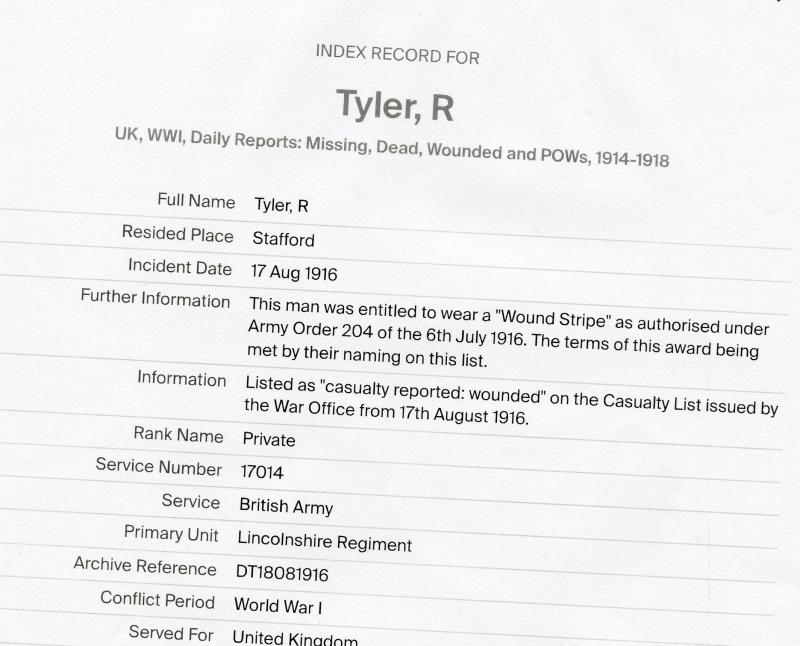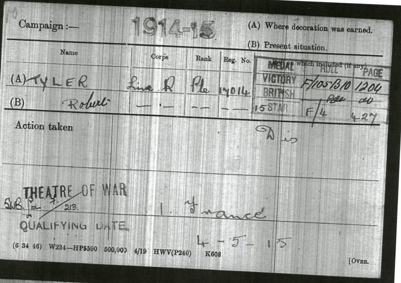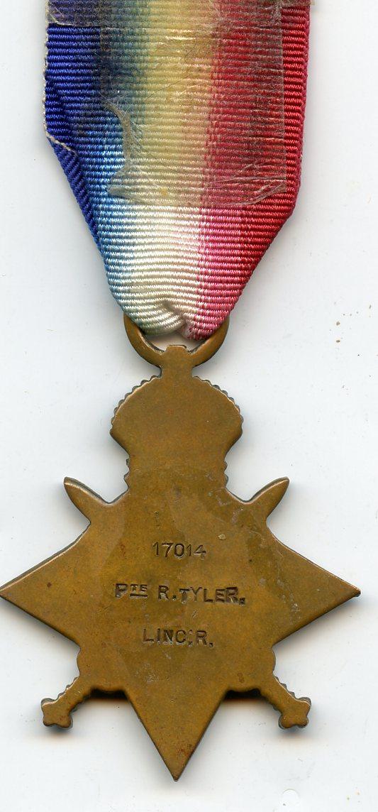 1914-15 Star Medal 17104 Pte R Tyler, Linc R Together with medal index card to Pte Robert Tyler, Lincolnshire Regiment Pte Tyler was wounded August 1916
