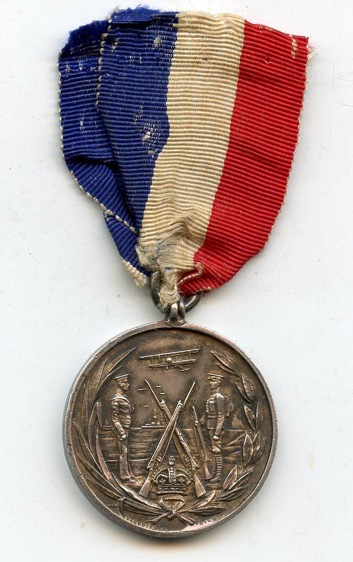 silver, hallmarks for Vaughton & Sons, Birmingham 1920, 32mm, obverse with crossed rifles to centre, sailor and soldier either side, surrounded by wreath, the reverse with 'Kingdom of Mourne Presented for Voluntary Service in the Great War 1914-1918,'