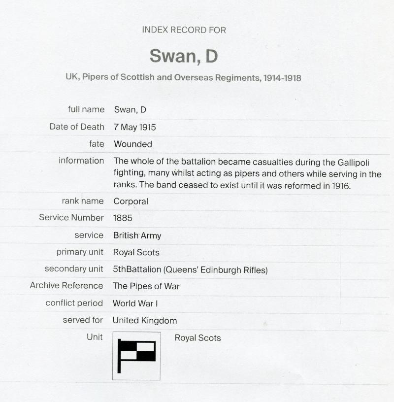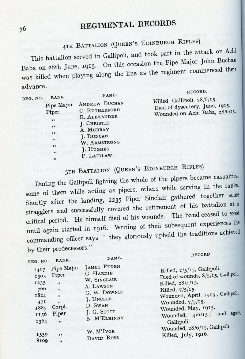 The whole 5th Battalion Royal Scots of the battalion became casualties during the Gallipoli fighting, many whilst acting as pipers and others while serving in the ranks. The band ceased to exist until it was reformed in 1916.