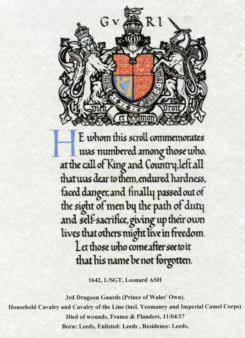 Lance Sergeant Leonard Ash, 3rd Dragoon Guards (Prince of Wales' Own) was wounded Feb 1916 and later was Killed in Action on 11 April 1917