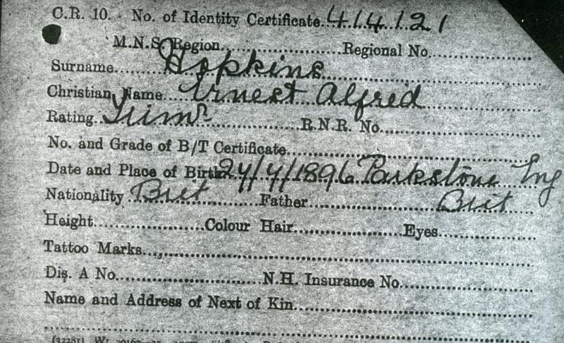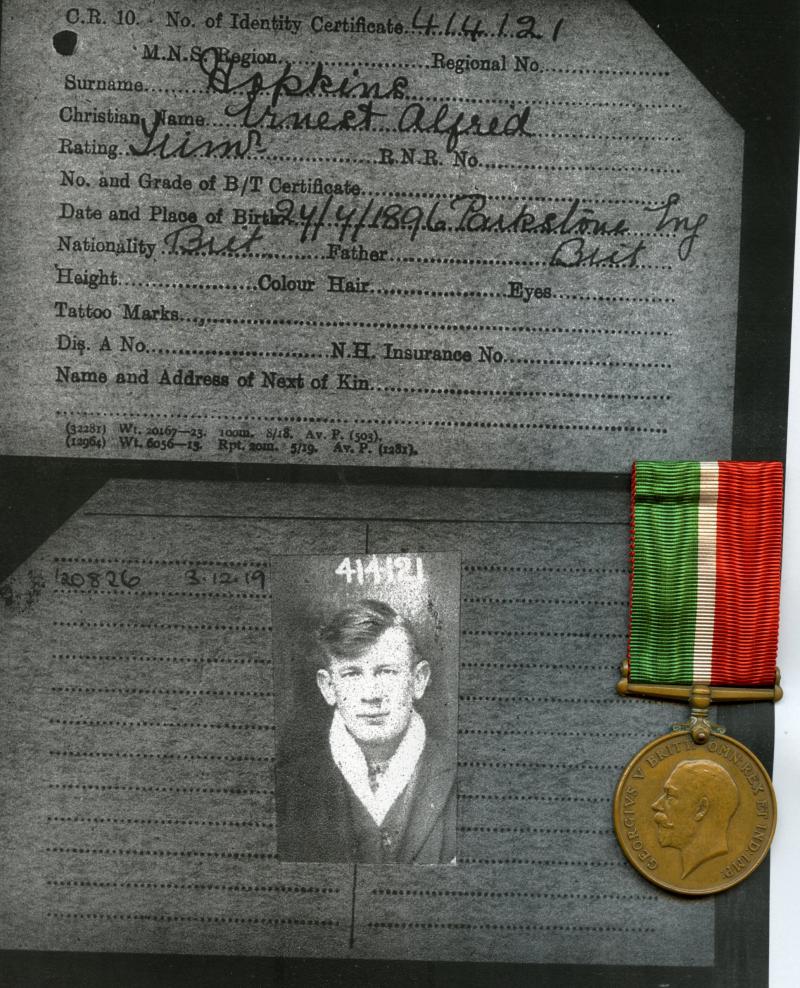 Mercantile Marine War Medal 1914-18 Ernest A Hopkins With copy of Merchant Navy Identity Certificate with photograph Born in Parkstone on the 27th July 1896