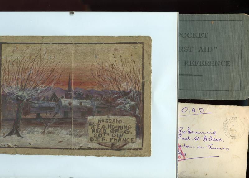 (32810 Pte. E.G. Hemming. Oxf. & Bucks. L.I.), with the following related items: - The recipient´s Certificate of Disembodiment, dated 25.3.1919 - The recipient´s Diary for 1918 - Pocket "First Aid" Ready Reference Booklet - Various letters and Christmas cards from the recipient to his family - Approximately 500 photographs relating to the War - Three framed drawings, one a portrait of the recipient (2)