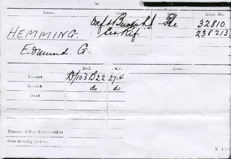 32810 Lance Corporal Edmund Guy Hemming, born 1893; enlisted in the Queen´s Own Oxfordshire Hussars, 30.9.1914; served during the Great War with the Oxfordshire and Buckinghamshire Light Infantry; transferred 2nd Scottish Rifles; disembodied, 25.3.1919.