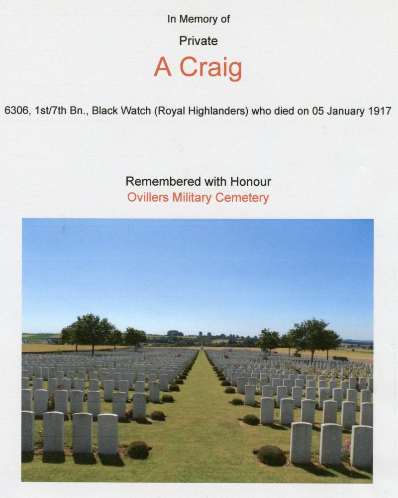 Private Alexander Craig 7th Black Watch 9 Fishacre Terrace Arbroath, was the eldest son of John Craig, formerly of ordie Oathlaw and Mrs Craig 15 Culloden Road He married Margaret Marshall Wood and left 3 sons and two daughters. He was 33 years of age,and before joining the army was employed as a ploughman at Little Cairnie Farm Arbroath . He joined the Army in 1916 and after a few months training at Nigg he was sent over to France. Private Craig was Killed in Action on the 5th of January 1917, The first day he was in the trenches, and is buried in the British Military Cemetery at St Ollivers. His brother was Killed in 1916