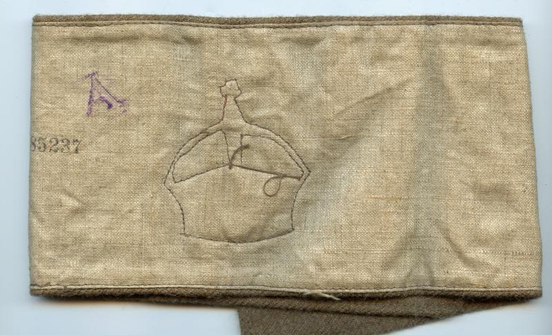 armband secured at the rear by 2 buttons . The front of the armband with red felt Kings crown . Backing with makers details and Army Authority details
