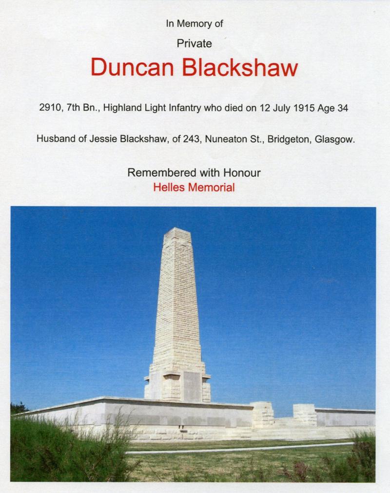 Husband of Jessie Blackshaw, of 243,Nuneaton St., Bridgeton, Glasgow.