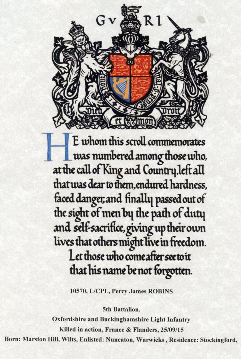 Together with copy of scroll and Commonwealth War Graves Details and Medal Index Card and photo of Grave and further research